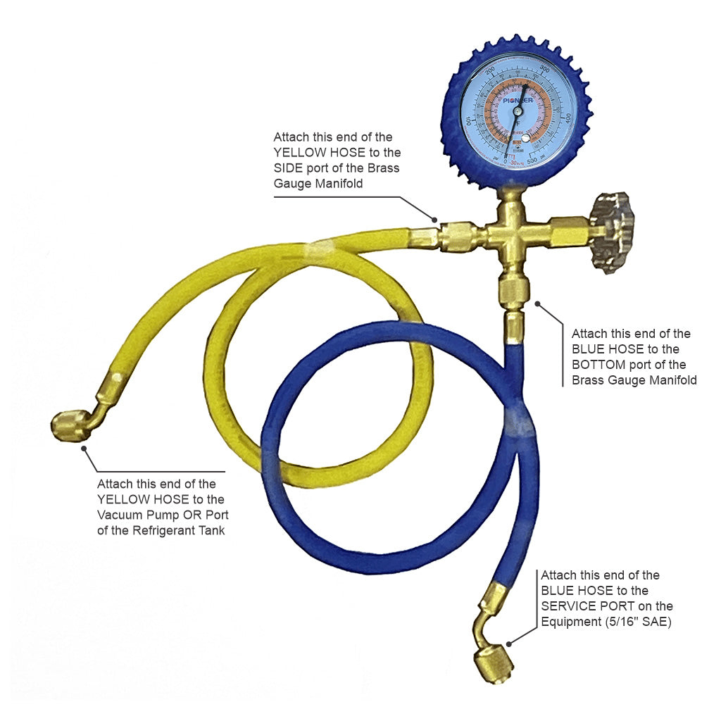 The blue hose connects to the service port on the unit and then the yellow hose connects to your vacuum pump. The blue hose is 5/16" ready to connect to the outdoor unit. The yellow is 1/4" for most vacuum pumps. The depicted valve isolates the gauge itself. This gauge also comes with a diagram on the packaging box. -